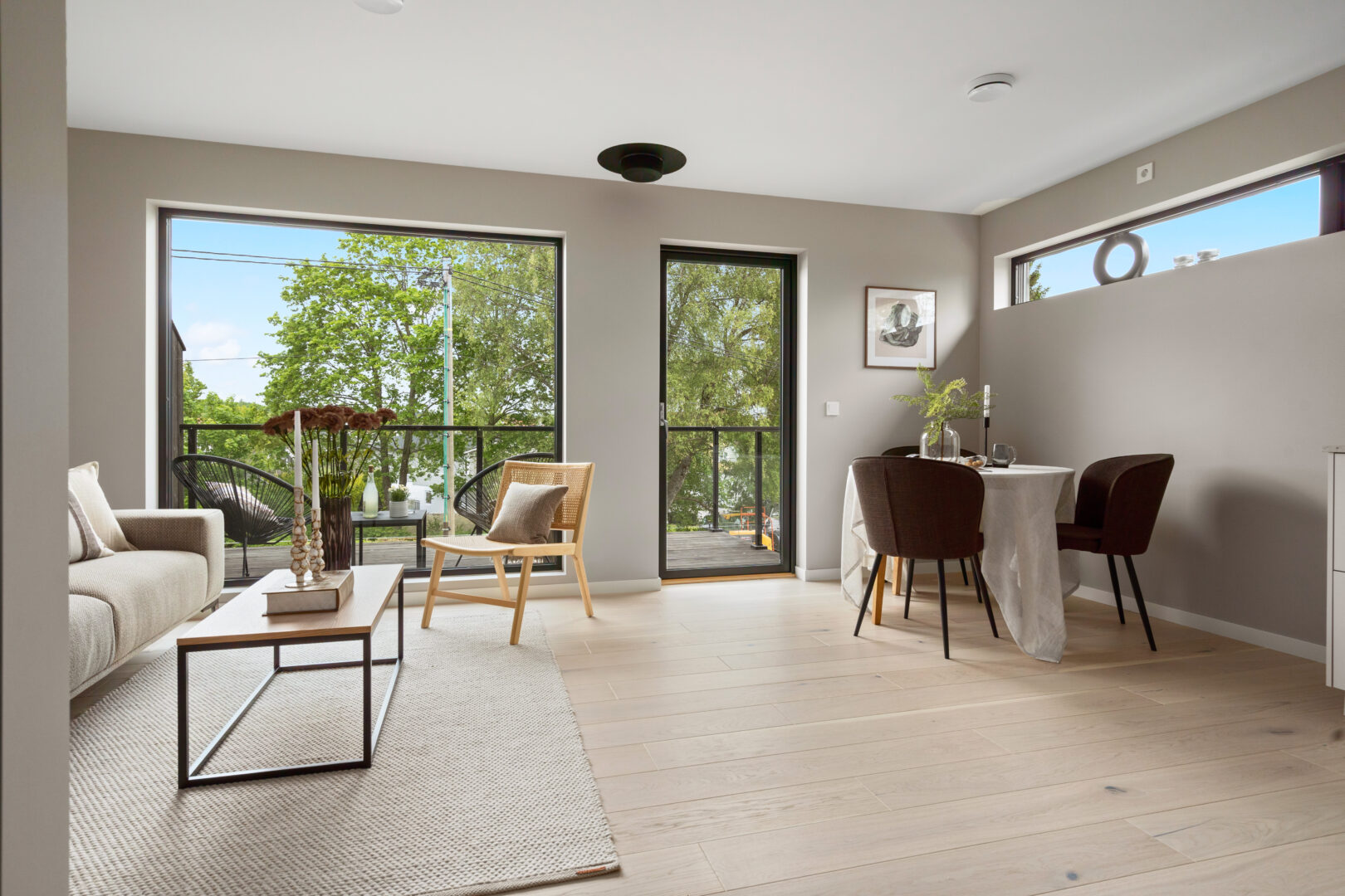 Velkommen til en nyoppført og moderne halvpart av en vertikaldelt tomannsbolig med attraktiv beliggenhet på Lisleby i Fredrikstad. Her får du en gjennomtenkt bolig med god planløsning over to etasjer, lyse og moderne materialvalg, tre soverom fordelt på begge plan og flere flotte uteplasser. Den åpne løsningen mellom stue og kjøkken skaper et luftig og sosialt hovedrom med rikelig naturlig lys. Boligen ligger i et sentralt og etablert boligområde, perfekt for familier eller par som ønsker en behagelig hverdag. I nærheten finner du både skole, barnehage, kollektivtransport og fine turområder. Fredrikstad sentrum ligger kun 3,5 4 km unna. Dette er et hjem som kombinerer moderne komfort med en sentral, men tilbaketrukket beliggenhet.