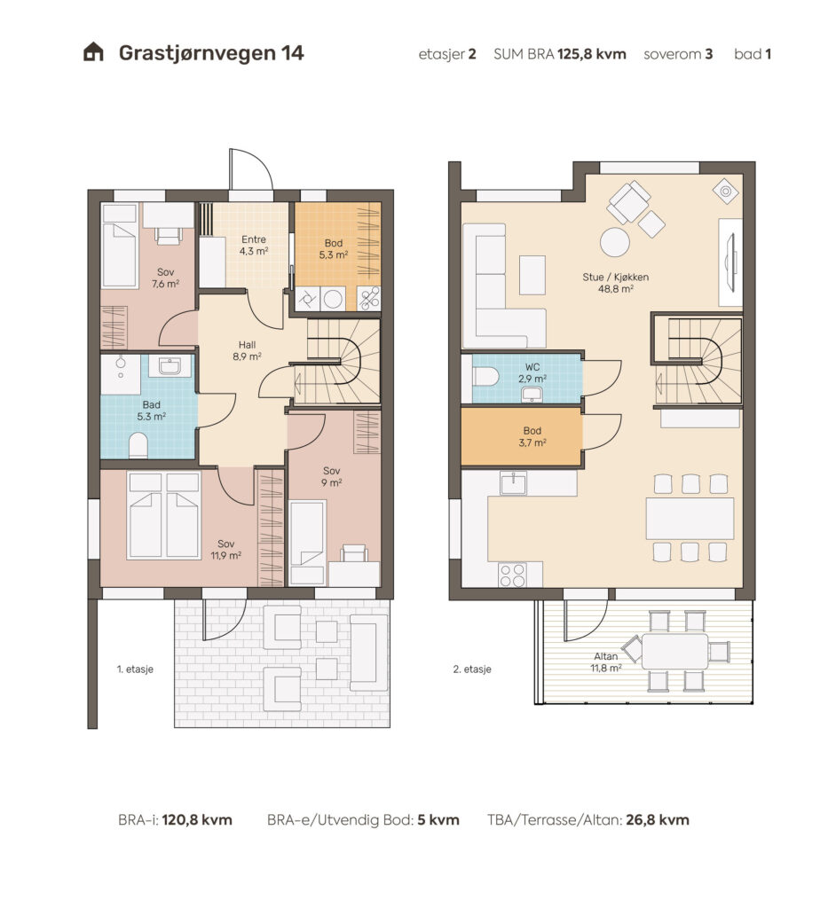 Uansett hvilken bolig man velger, får man et hus med smarte oppbevaringsmuligheter, ekstra luftig takhøyde i andre etasje, tre soverom og separat vaskerom.