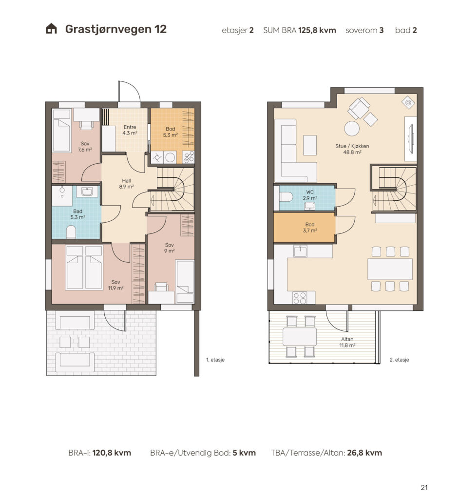 Her kan man velge mellom bolig med livsløpsstandard, hvor man har stue og kjøkken i 1. etg, eller variant med luftig stue og kjøkken i 2. etg.