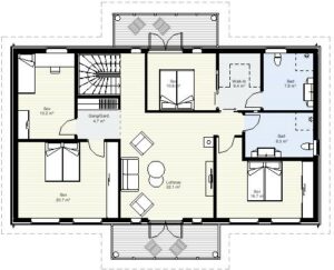 Huset gir mye plass til tross for en forholdsvis liten grunnflate, takket være full takhøyde i begge etasjer. Bjoa har tre store soverom og en stor loftstue i 2 etasje, et kontor eller et ekstra oppholdsrom eller 4 soverom nede i 1 etasje. Med et bad og stort vaskerom nede i 1 etasje og to bad oppe i 2 etasje, passer Bjoa perfekt for familier som ønsker mye hus for pengene.