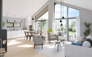 Huset er utformet for å maksimere gjennomlys og åpenhet, med store vindusflater som slipper inn rikelig med lys. Den åpne planløsningen på 35,2 m² for kjøkken og stue, fremmer et godt sosialt miljø, noe som er avgjørende for et behagelig bomiljø. Naturlig lys strømmer gjennom hele huset, og reduserer behovet for kunstig belysning.