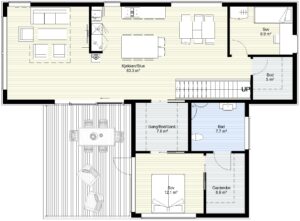 Husmodellen Hovda er utformet med tanke på fleksibilitet og tilpasningsdyktighet. Første etasje inkluderer en romslig kjellerstue som kan benyttes som ekstra soverom eller oppholdsrom. Det er også et dedikert vaskerom/teknisk rom på 11 m², som gir praktisk funksjonalitet til hverdagen. På denne etasjen har en også eget gjeste wc, stort bad, sportsbod med utvendig dør og to soverom.