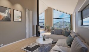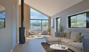 Her blir det høyt under taket, faktisk – opp mot 4 meter i stuen. De ekstra store vindusflatene vil bidra til mye naturlig lys og utsikten du måtte ha til områdene utenfor, virkelig kommer til sin rett.